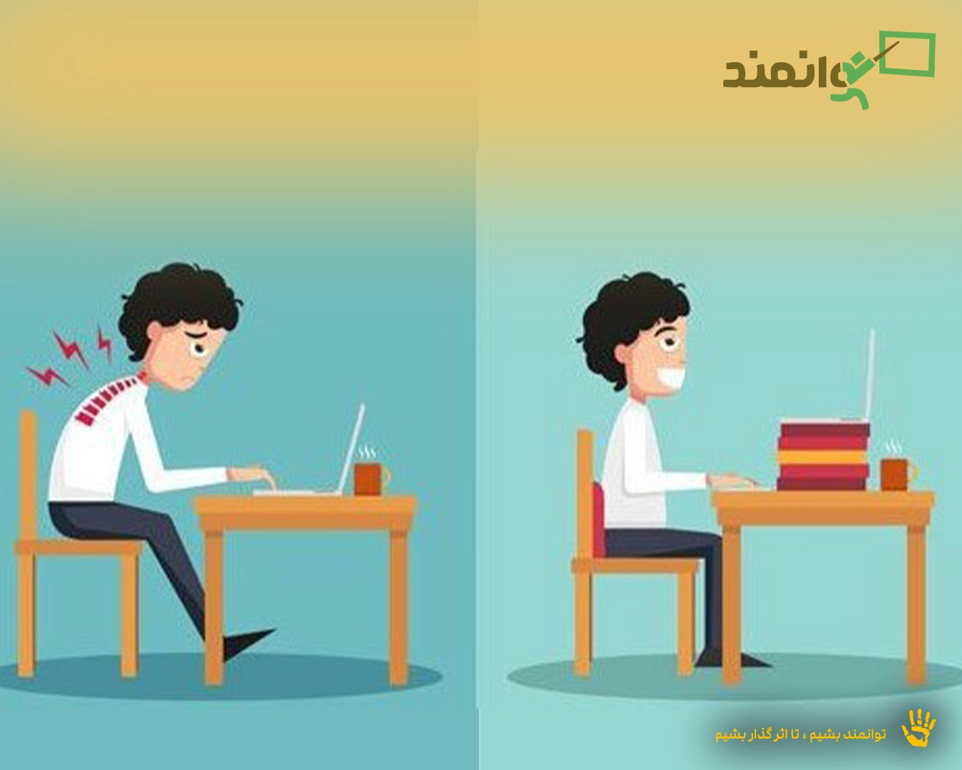 مطمئن شوید که آن‌ها در پشت میز یا نیمکت، حالت صحیح نشستن را رعایت کرده‌اند؛ یعنی کف پاها بر روی زمین باشد، در نشستن کمر را صاف نگه داشته باشند، و دست ها نیز به‌راحتی با زاویه‌ی ۹۰ درجه بر روی میز قرار گرفته باشد. این حالت نشستن باعث می‌شود که دانش‌آموز به سرعت خسته نشده و در حالت صحیح برای نوشتن قرار گرفته باشد.